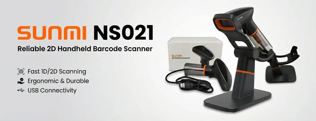 Ready to Use Out of the Box We believe in simplicity. When you purchase this scanner, you receive a complete kit designed for immediate deployment. The box includes the Sunmi NS021 unit, a high-quality USB data cable, and a user guide. You can also opt for the additional hands-free stand, a favorite add-on for supershops and pharmacies that need to scan items quickly without holding the device.